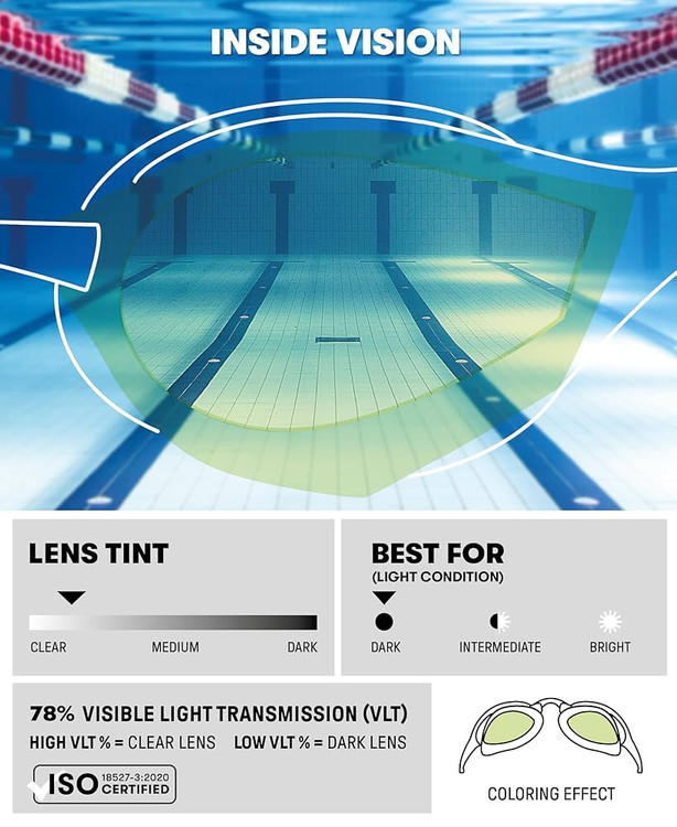 - مناسب برای شنا در محیطهای داخلی و نور کم، با لنزهای پلیکربناتی مقاوم و ۵ عدد پل بینی قابل تعویض برای تنظیم دقیق و شخصیسازیشده.